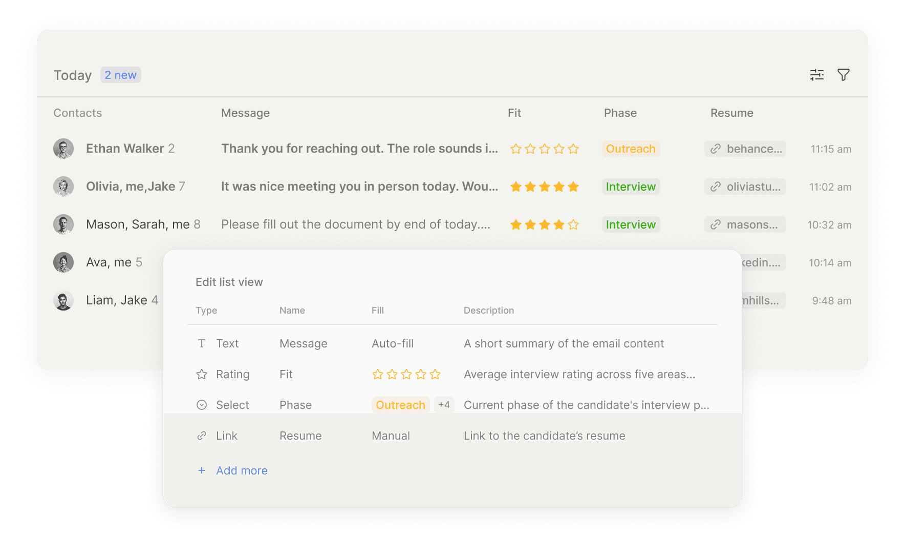 Automatically extract key details from emails and add custom fields to track things like candidate stage, budgets, or priorities.